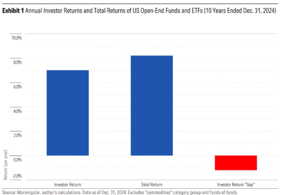 A long-term Morningstar study on investor returns versus the broader market estimate the average dollar invested in US mutual funds and exchange-traded funds earned 7.0% per year over the 10 years ended Dec. 31, 2024 (“investor return”). That’s about 1.2 percentage points per year less than these funds’ 8.2% aggregate annual total return (“total return”) over that span assuming an initial lump-sum purchase. That 1.2 percentage point “investor return gap," which is explained by the timing and magnitude of investors' purchases and sales of fund shares during the 10-year period, is equivalent to around 15% of the funds’ aggregate total return.