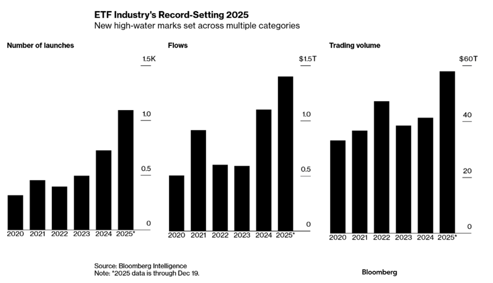 With less than two weeks remaining in the year, 2025 is shaping up as a record-breaking period for the US exchange-traded fund industry, which now manages more than $13 trillion in assets. US-listed ETFs have attracted approximately $1.4 trillion of net inflows year to date, decisively surpassing the previous annual record of $1.1 trillion set in 2024. Product activity has accelerated in parallel, with roughly 1,100 new ETFs launched, about 50% more than last year, while trading activity also reached new highs, with annual ETF trading volume approaching $60 trillion. According to Bloomberg Intelligence, the last time flows, launches, and trading volume all reached record levels in the same year was 2021, underscoring how exceptional 2025 has been for the industry.