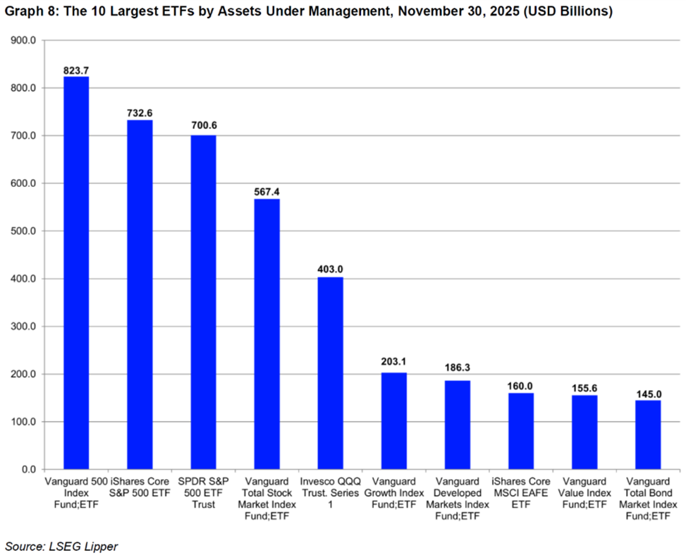 The gap between the two market leaders and the rest of the industry remains wide, reinforcing powerful scale advantages and raising meaningful barriers to competition in core beta exposures. Size allows dominant providers to operate flagship ETFs at razor-thin expense ratios, absorb operational costs across vast asset bases, and offer unmatched liquidity—advantages that are difficult for smaller issuers to replicate. As a result, newer or smaller competitors face a structural challenge: even when they offer similar index exposure, they struggle to match the combination of cost efficiency, trading depth, and brand recognition embedded in the largest funds. Over time, this dynamic further entrenches the incumbents’ position, concentrating asset growth in a narrow set of mega-funds and limiting the scope for meaningful competition in the most commoditized segments of the ETF market.