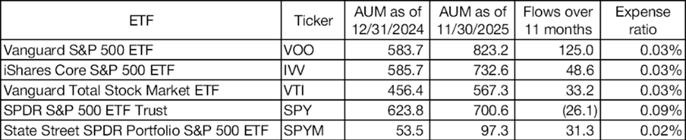 At a more granular level, 2025 also marked a clear and increasingly important shift toward lower-cost vehicles even within identical benchmark exposures. As core equity exposure has become fully commoditized and tracking differences between providers are negligible, expense ratios have emerged as one of the few remaining variables investors can directly control. Even small fee gaps—measured in single-digit basis points—compound into a meaningful performance drag over long holding periods when applied to large, long-term allocations. This dynamic became increasingly visible in 2025 as investors grew more discerning in their choice of core beta instruments.