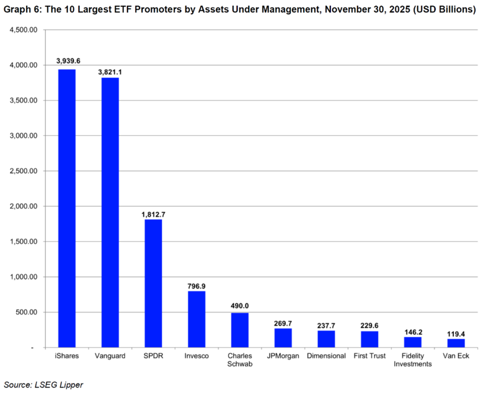 Beyond headline growth, however, the defining structural feature of the 2025 ETF boom has been extreme concentration, both at the fund and issuer level. According to LSEG data as of the end of November, only about 900 ETFs out of more than 4,700 listed in the US held assets above $1 billion, yet these funds controlled over 95% of total industry assets. Concentration at the very top is even more pronounced: the 10 largest ETFs alone accounted for roughly $4.1 trillion, or about 31% of total US ETF AUM. These dominant products are overwhelmingly broad, low-cost vehicles tracking US equity benchmarks—primarily S&P 500 and total-market exposures—highlighting investors’ continued preference for simplicity, liquidity, and scale even in a year marked by rapid product proliferation.